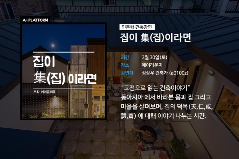 a0100z 의 성상우 소장이 진행하는 인문학 건축강연 <집이 集(집)이라면>이 건축코워킹센터 에이라운지에서 진행되었습니다. 본 강연에서는 고전을 통해 문자와 집의 구조적 유사점을 발견하고, 집이 지닌 연결과 결합 그리고 배치에 대한 근원적 이해를 통해 우리의 도시를 이해하는 시간을 마련하였습니다.
