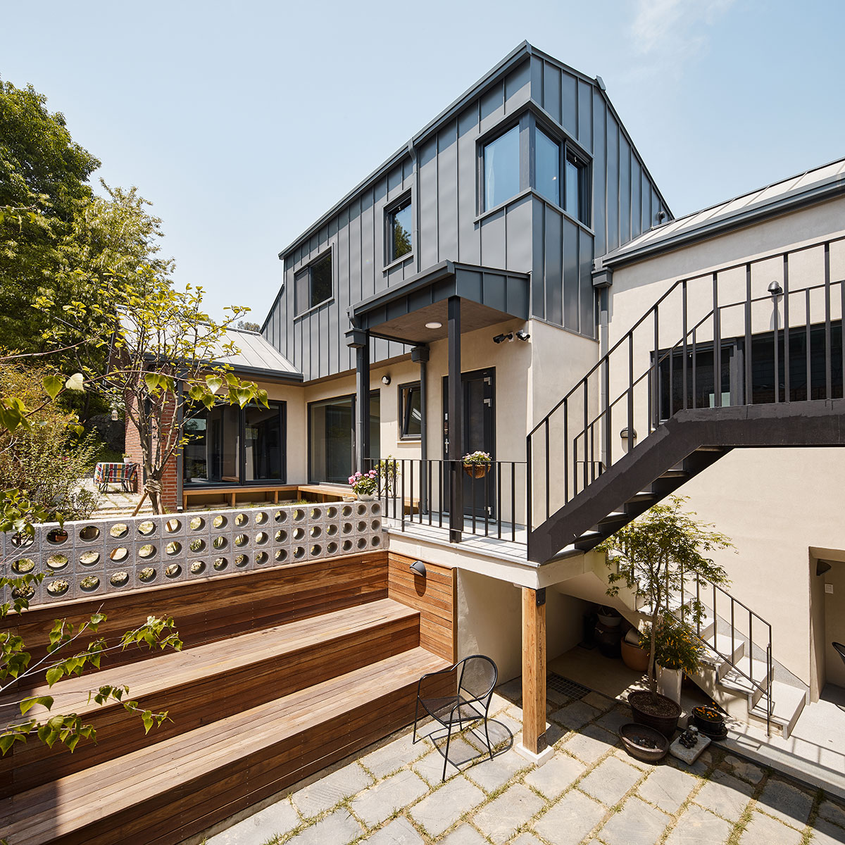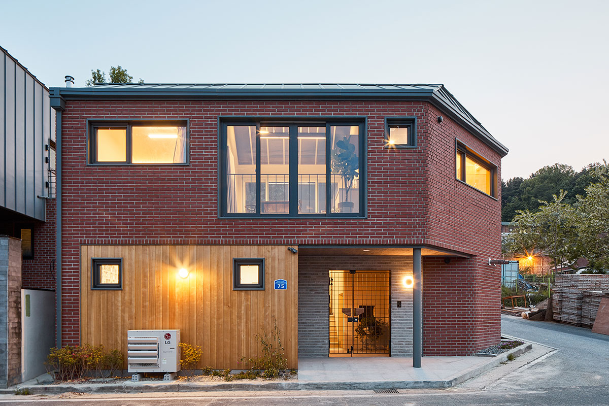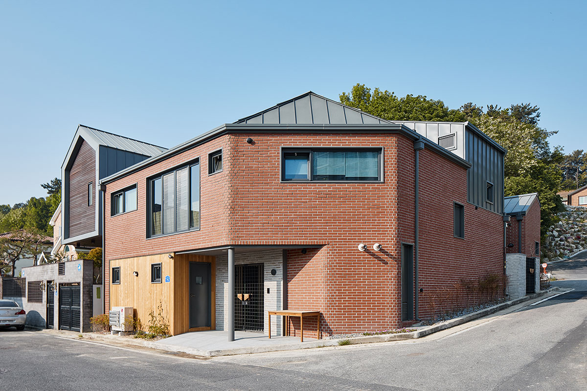 집은 전체적으로 ㄴ자와 ㅡ자의 연결이 합쳐진 ㄷ자형을 띠고 있다. 외관 디자인의 경우 너무 도드라지지 않고 주변과 잘 어울리는 재료로서 붉은 벽돌을 선택했으며, ㄷ 자형 건물의 각 모서리는 부드러운 곡선으로 마무리하여 날카롭게 보이지 않도록 하였다.